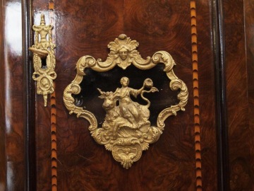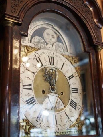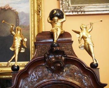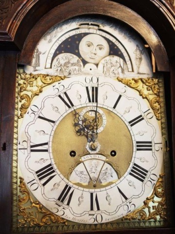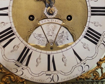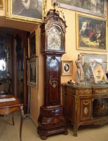 When shopping over 50 000 Kč Free transport.walnut wood, figure of Atlas and two angels playing trumpets, clock shows phases of the moon, calendar, days of the week, signed, width: 650 mm, height: 2,700 mm, depth: 370 mm, the Dutch 1680