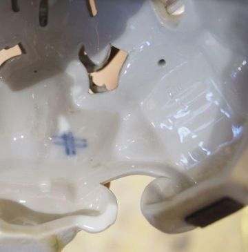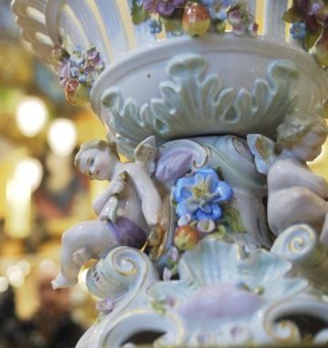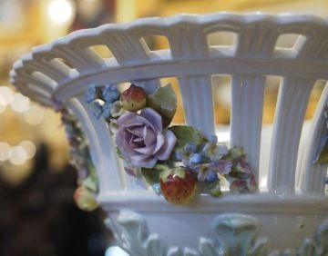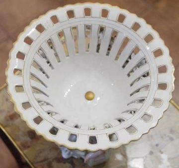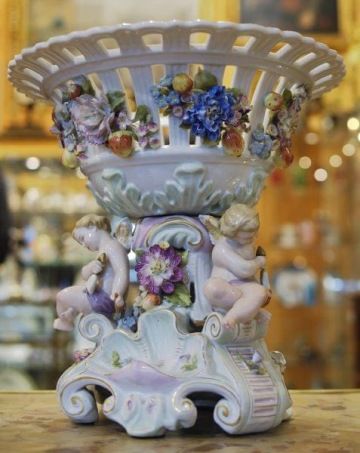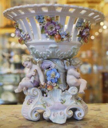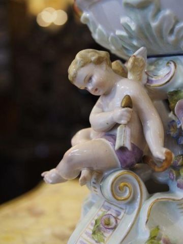 When shopping over 50 000 Kč Free transport.decoreted with flowers and figural sculptures of Cupids, painted, glazed, gilded, marked Volkstedt, Germany, height: 300 mm, diameter: 310 mm