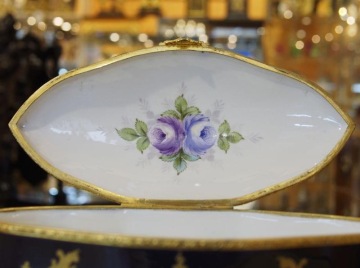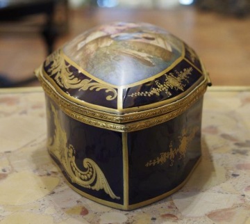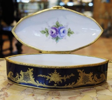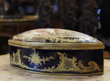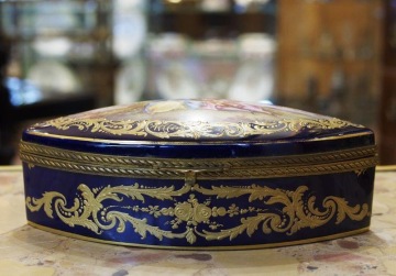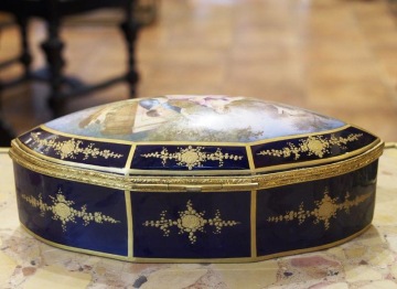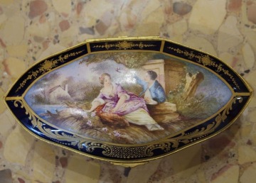 When shopping over 50 000 Kč Free transport.decorated with cobalt, painted gallant scene, mark Sevrés Paris, width: 280 mm, height: 90 mm, depth: 150 mm, France 1880, in brass mounting, gilded, painted, glazed